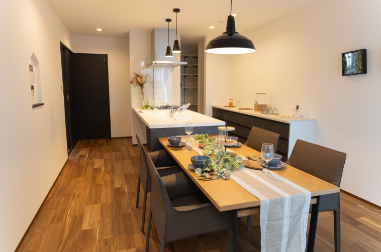 開放的なリビングのすぐそばには、家族の気配を感じながら料理ができる対面式のキッチンカウンター。収納力たっぷりのパントリーを備え、日々の暮らしをすっきりと整えます。キッチンの向かいには洗面室と浴室を配置し、家事の流れもスムーズに。動きやすさと心地よさがひとつになった、やさしい時間が流れる空間です。