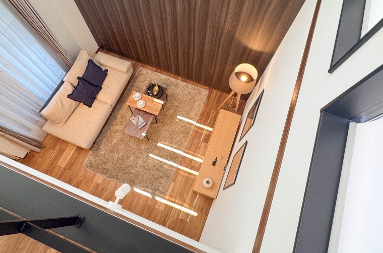 3階から見下ろすと、吹き抜けを通して光がやさしく床に落ちる様子が印象的。大きなFIX窓からこぼれる陽だまりが、時間とともに表情を変えながらLDKを包み込みます。