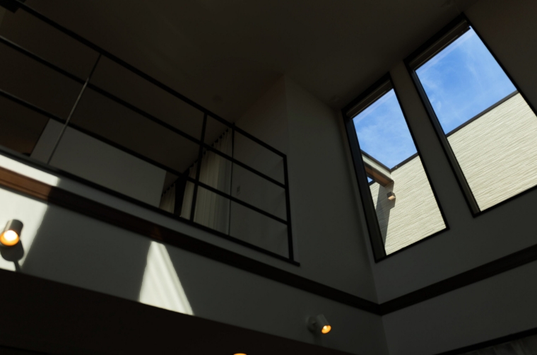 吹き抜け越しに広がる青空とテラスが、室内にのびやかな開放感をもたらします。大きなFIX窓から差し込む光がやわらかく反射し、時間とともに移ろう空の表情を楽しめる贅沢なひととき。家の中にいながら、外の心地よさを感じられます。