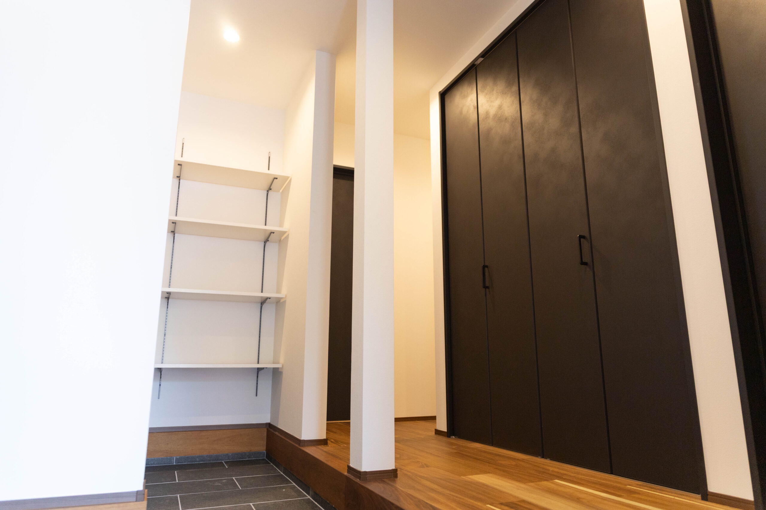 玄関を入ると、ゆったりとした土間続きのSICがお出迎え。ベビーカーやアウトドアグッズなど、大きな荷物もそのまま置ける便利なスペースです。“ただしまう場所”ではなく、外と内をやさしくつなぐ、暮らしの余白のような空間になりました。
