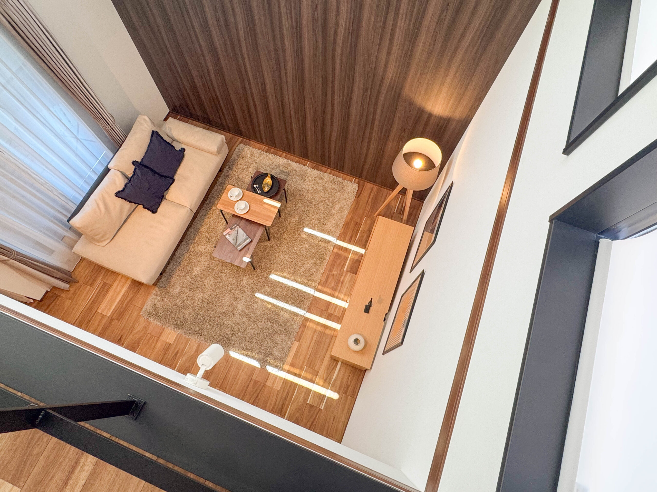 3階から見下ろすと、吹き抜けを通して光がやさしく床に落ちる様子が印象的。大きなFIX窓からこぼれる陽だまりが、時間とともに表情を変えながらLDKを包み込みます。