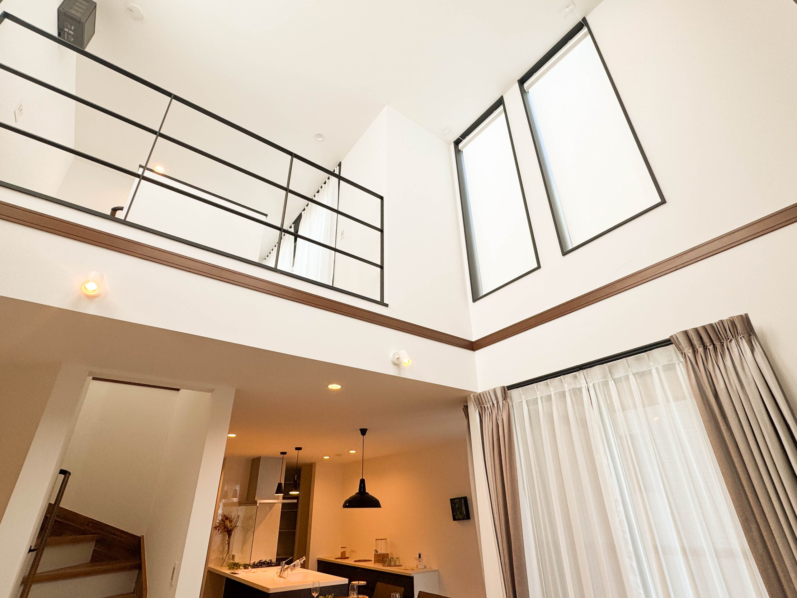 2階に広がるLDKは、吹き抜けと窓からやわらかな光が差し込む、心地よい家の中心。