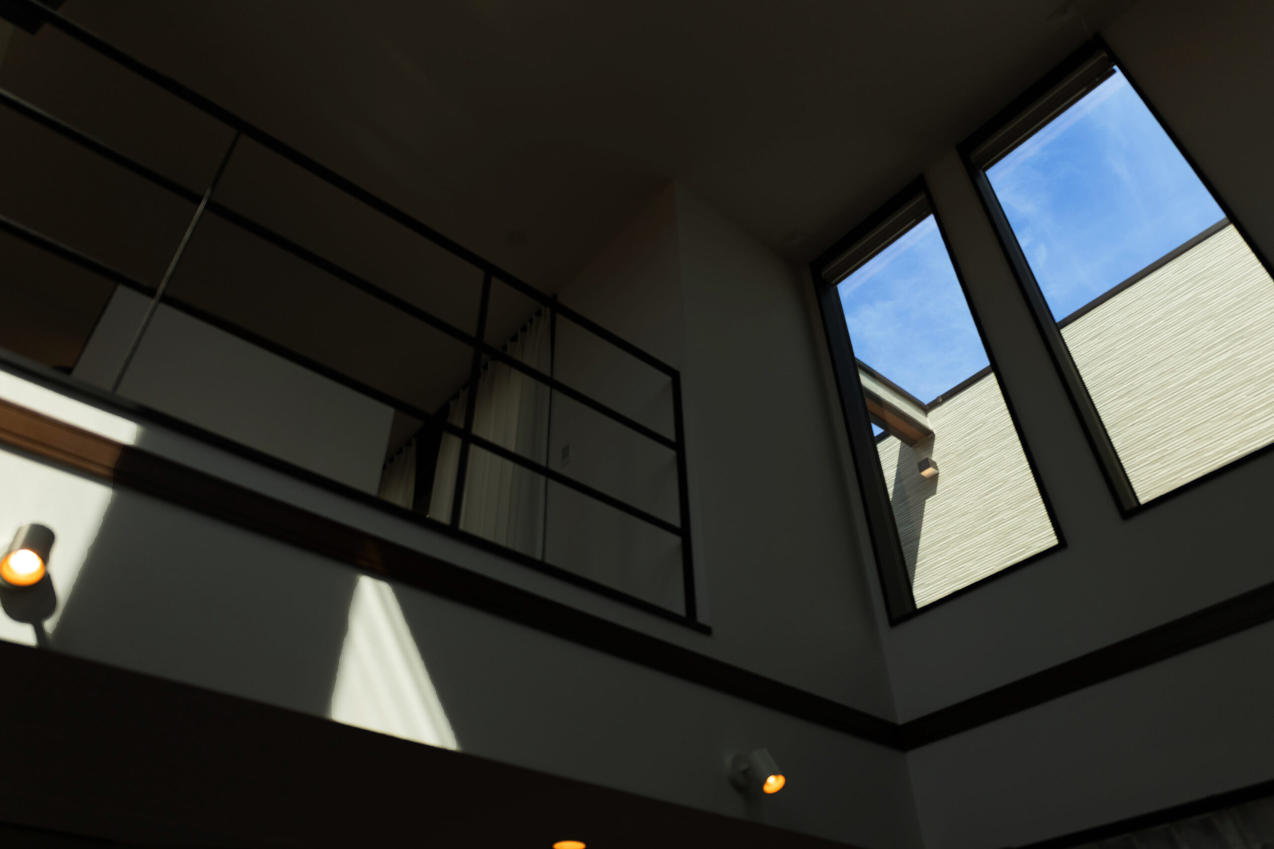 吹き抜け越しに広がる青空とテラスが、室内にのびやかな開放感をもたらします。大きなFIX窓から差し込む光がやわらかく反射し、時間とともに移ろう空の表情を楽しめる贅沢なひととき。家の中にいながら、外の心地よさを感じられます。