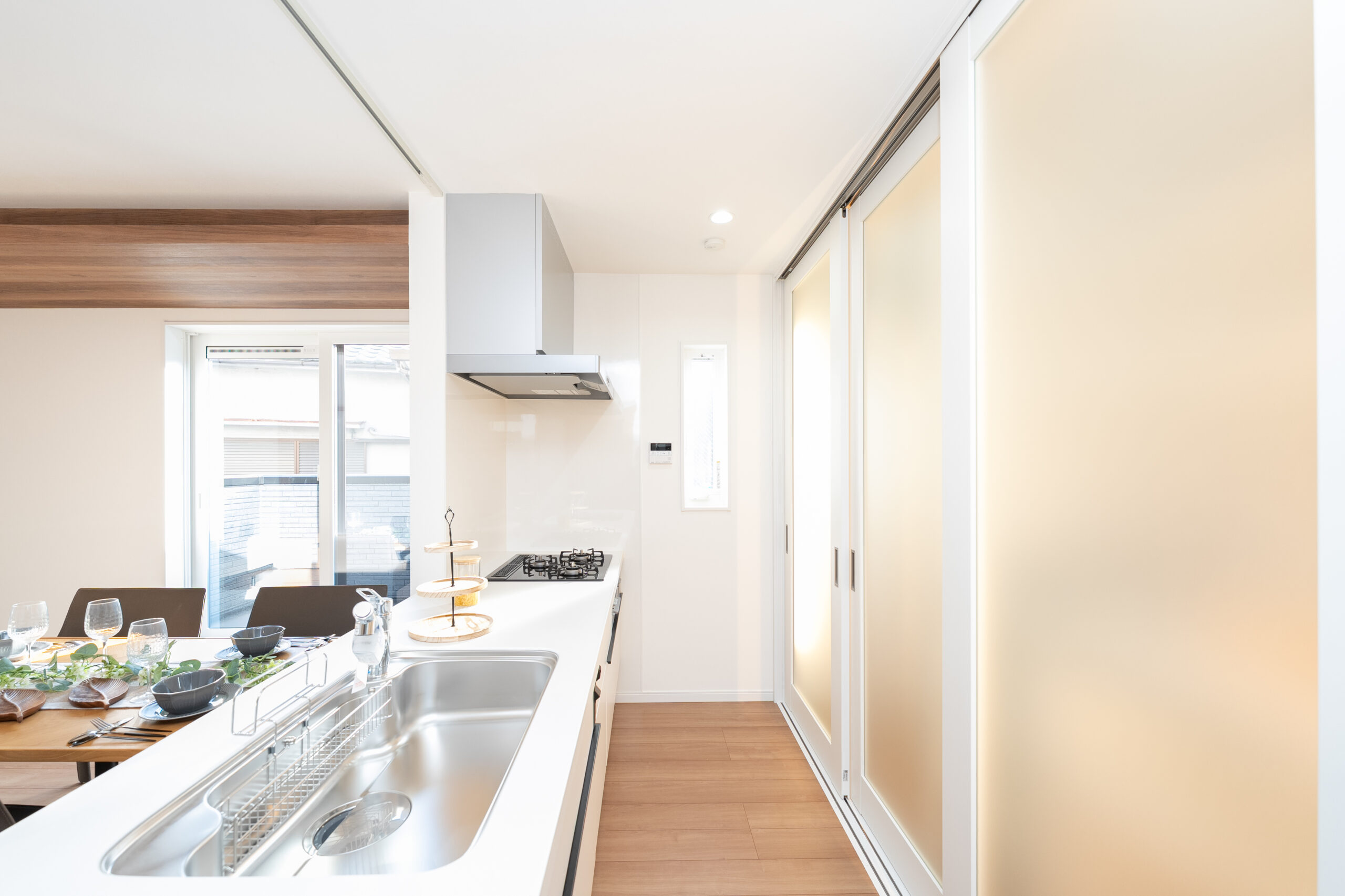 白の清潔感と直線的な美しさが際立つキッチンです。RACCO+パントリーで片付く仕組みまで整っています。
