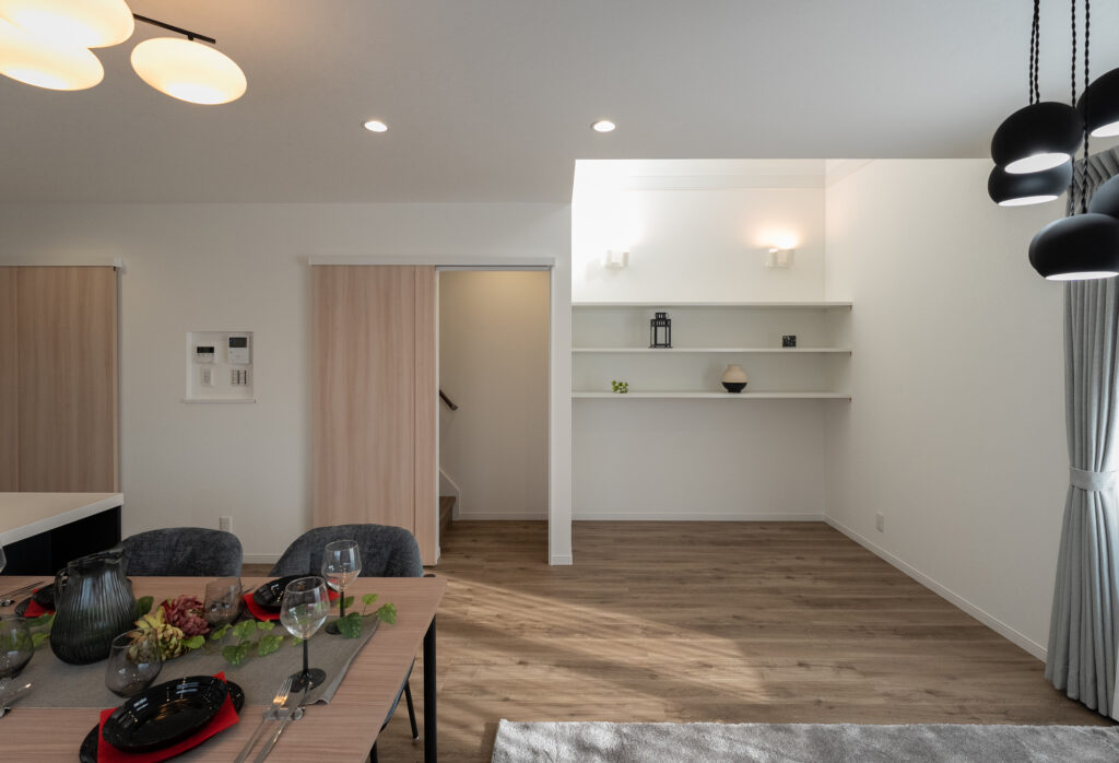 飾り棚が“見せる余白”になり、インテリアが映える空間です。棚下はスタディ/書斎として活用できます。