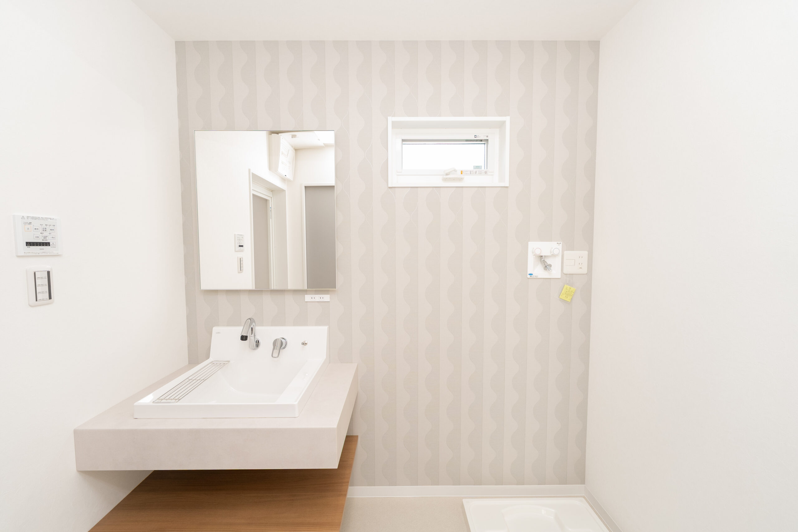 フロートタイプの洗面台で足元が抜け、空間が広く見える洗面です。波柄のアクセントクロスが上品に効き、清潔感に“表情”が生まれる空間です。