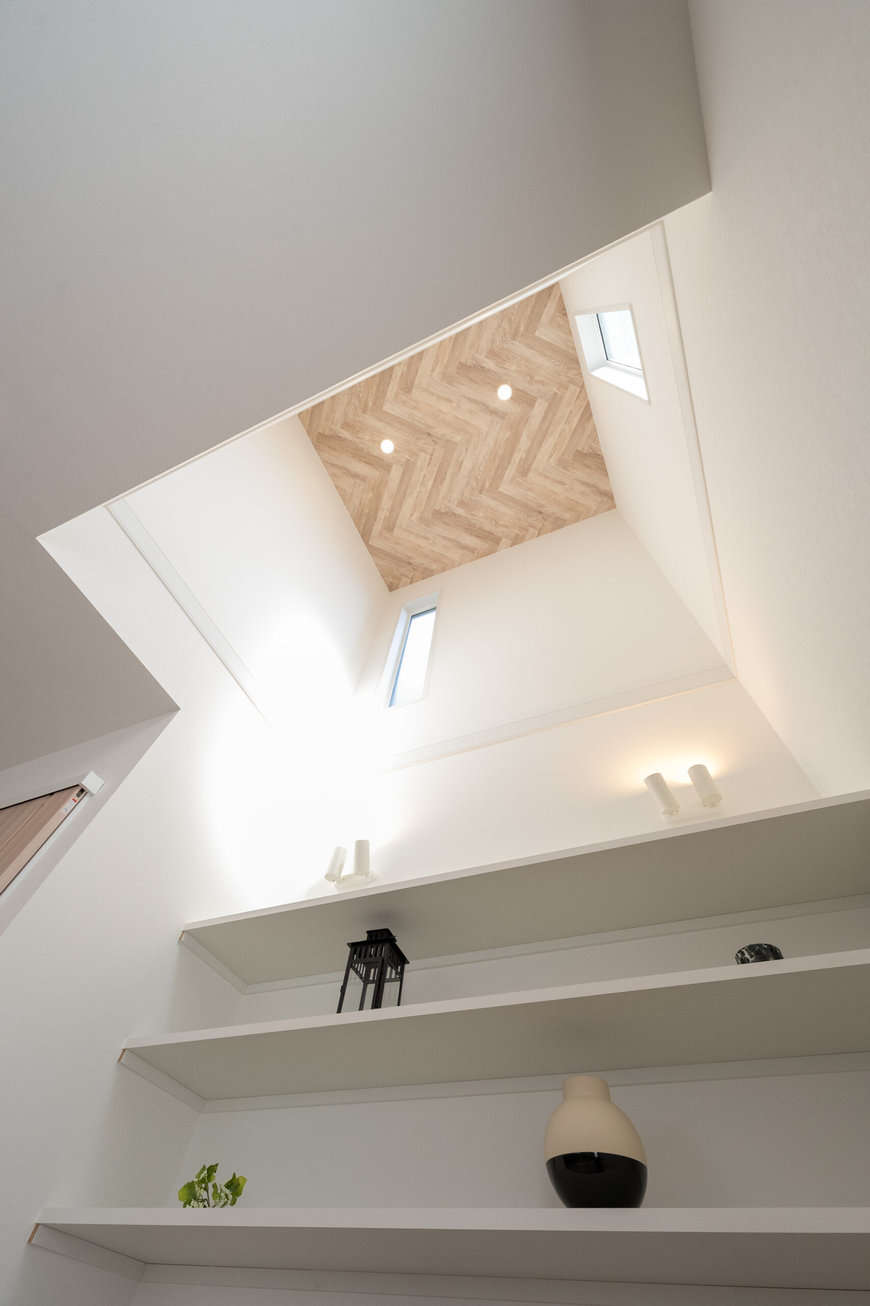 吹抜け壁面には飾り棚を設け、暮らしの「好き」を飾れる余白を用意しています。
